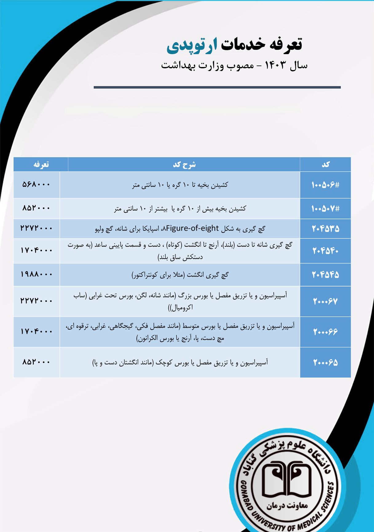 تعرفه خدمات ارتوپدی (بخش خصوصی)